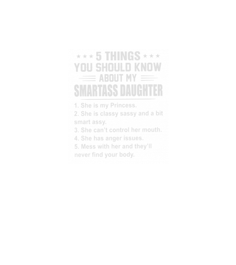 Shop 5 THINGS YOU SHOULD KNOW ABOUT MY SMARTASS DAUGHTER Short Sleeve Baby One-Piece custom made just for you. Available on many styles, sizes, and colors.