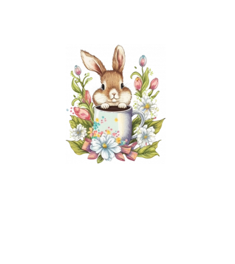 Cute easter bunny with flowers and a mug