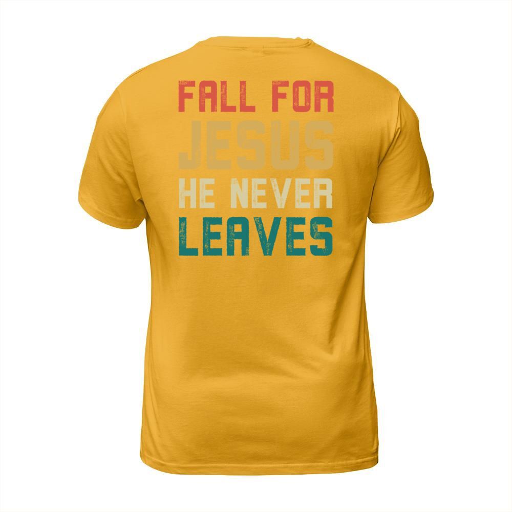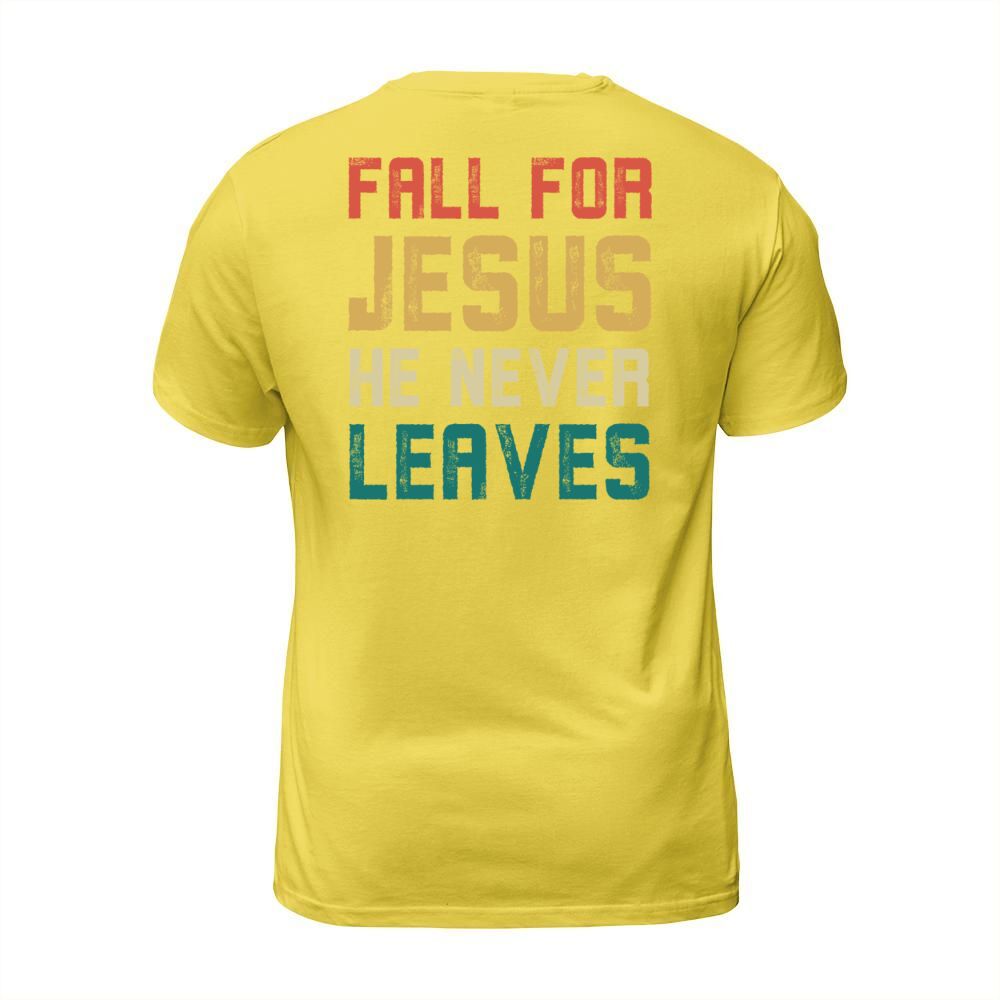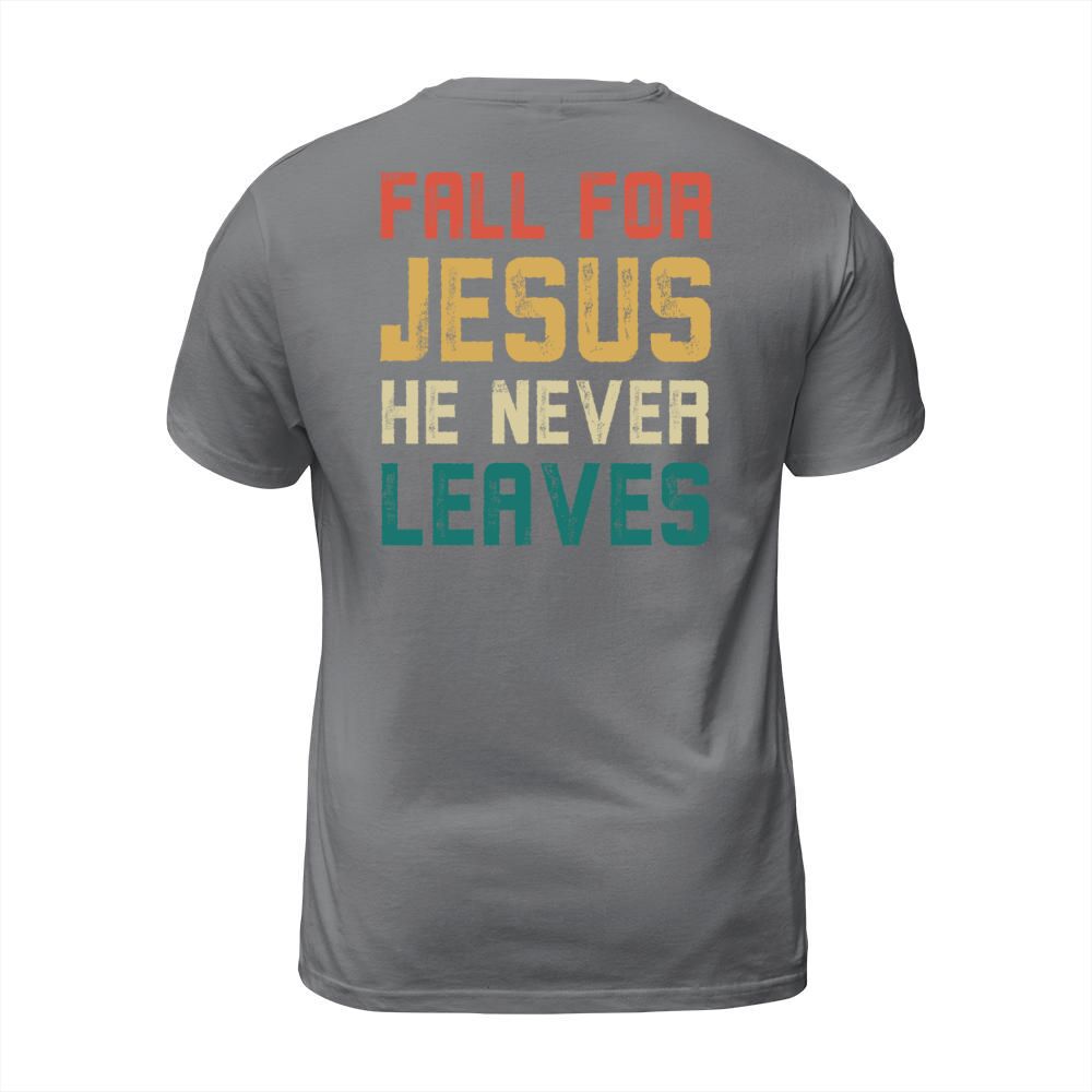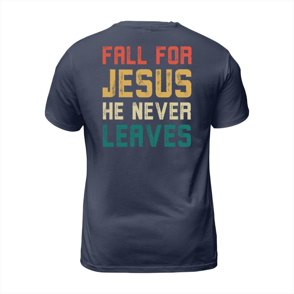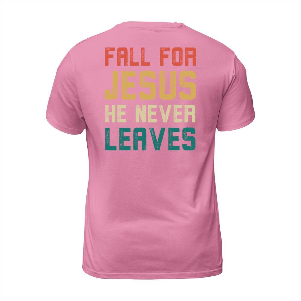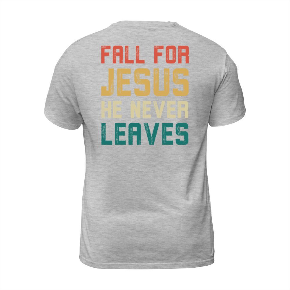 Shop Fall for jesus he never leaves Men's T-Shirt custom made just for you. Available on many styles, sizes, and colors.