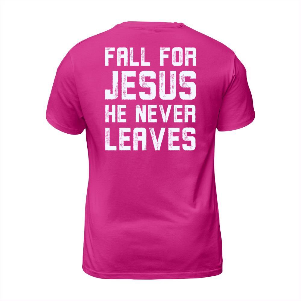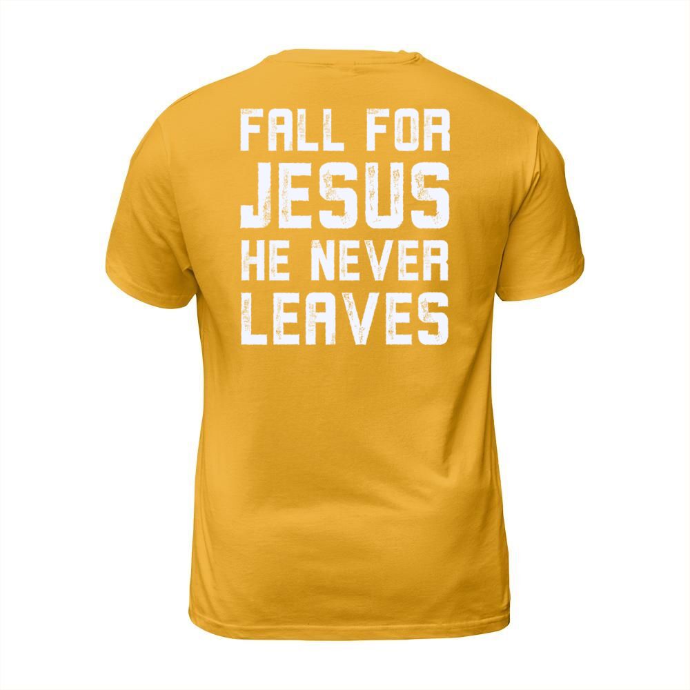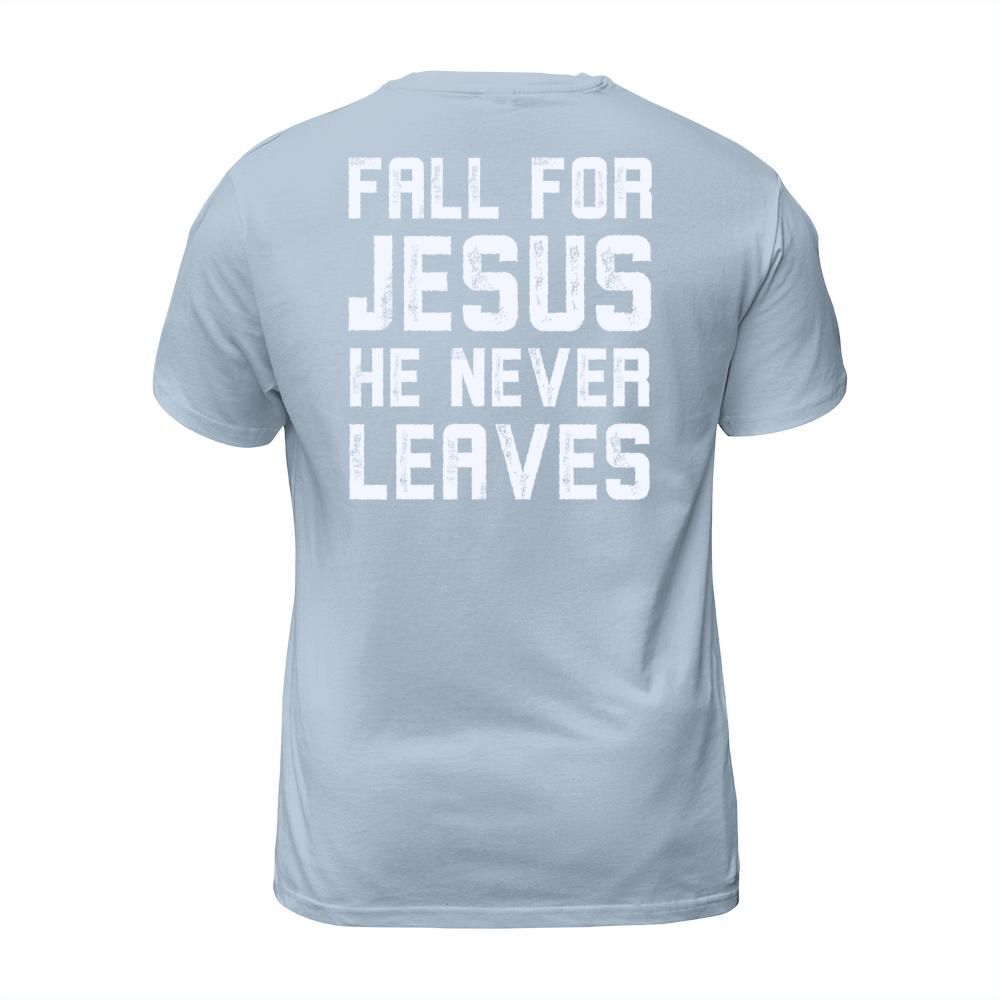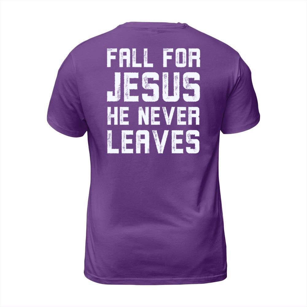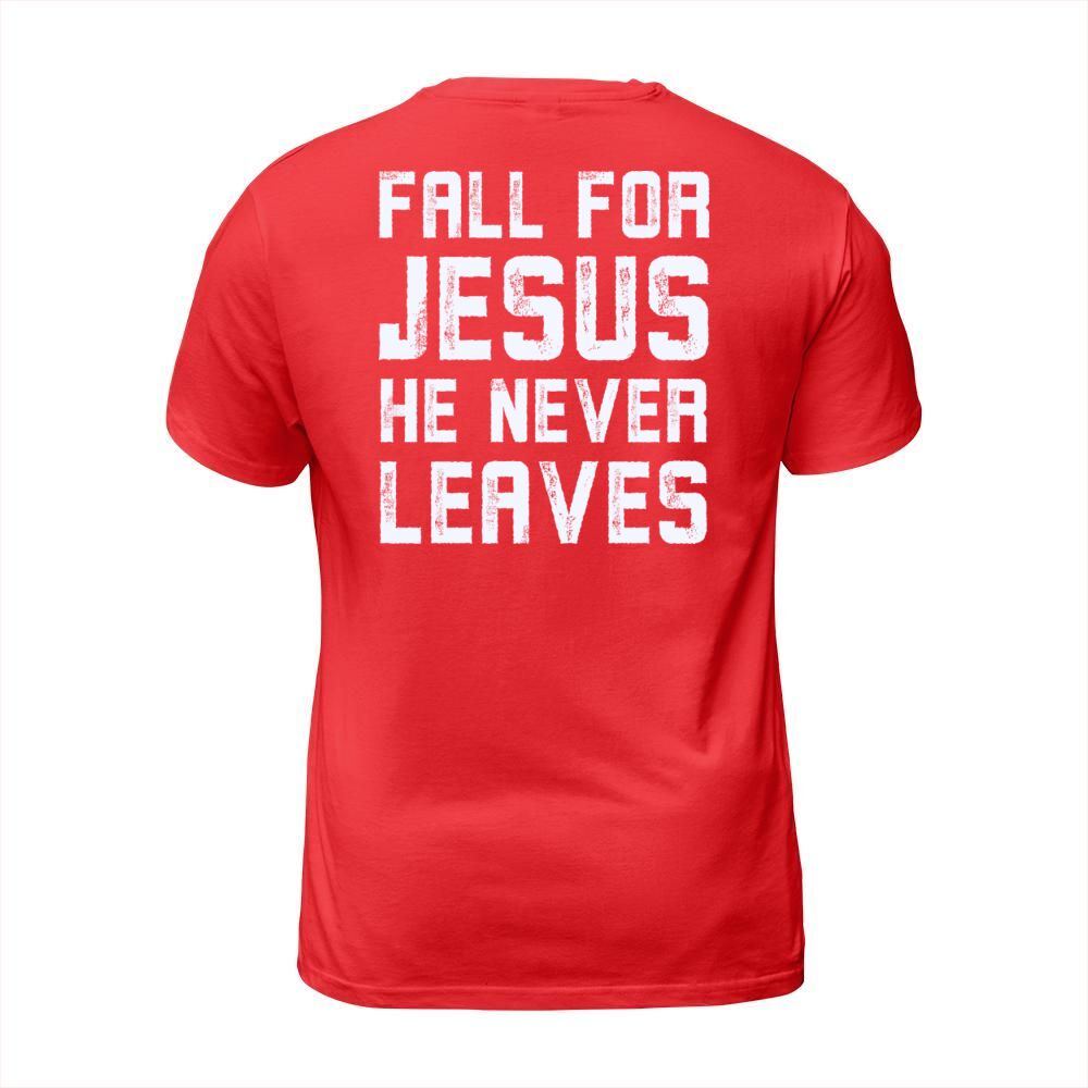 Shop Fall for jesus he never leaves Men's T-Shirt custom made just for you. Available on many styles, sizes, and colors.