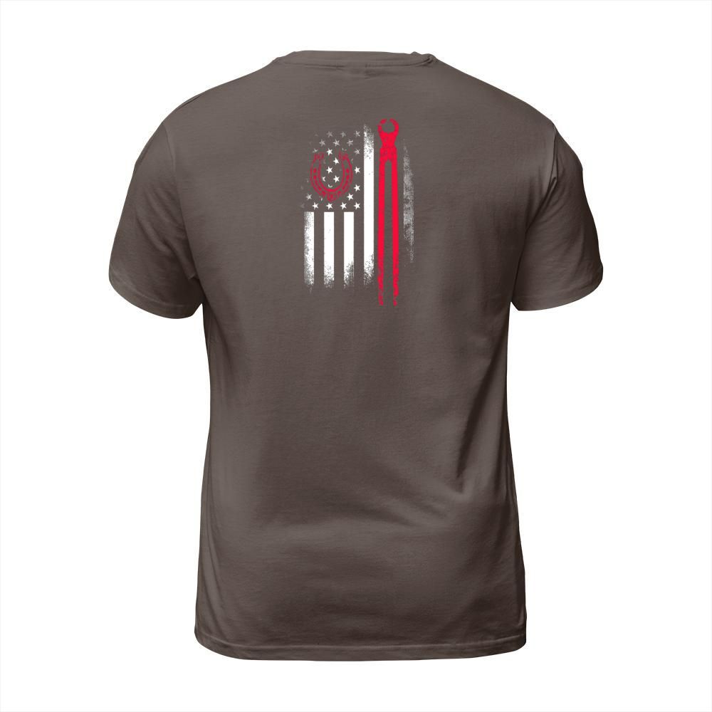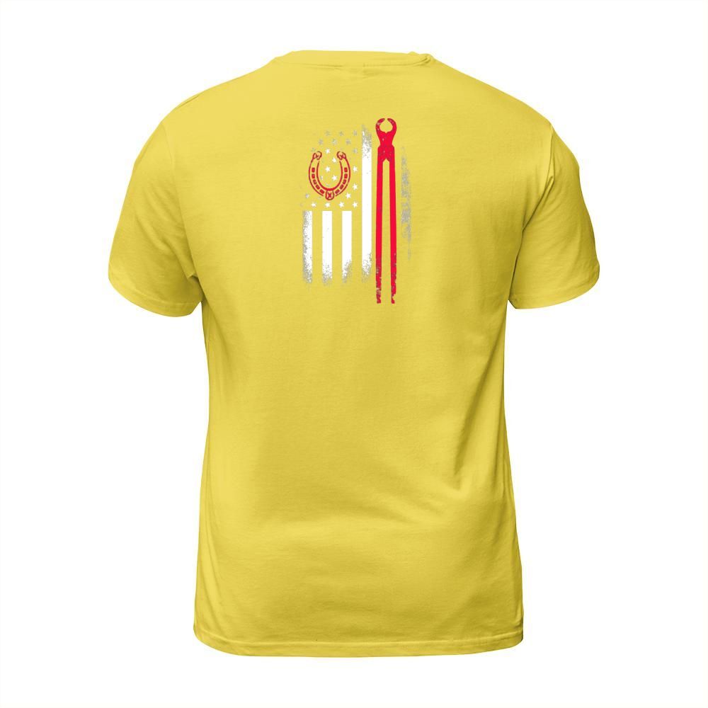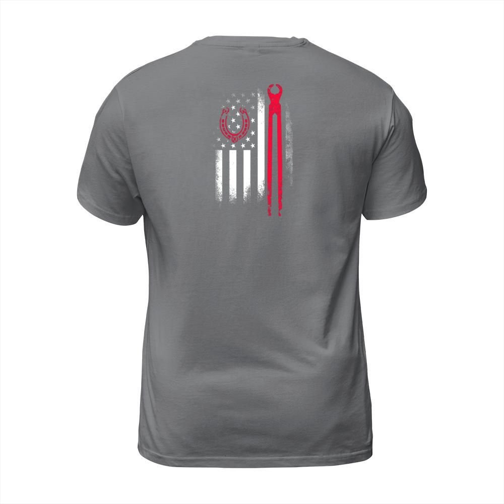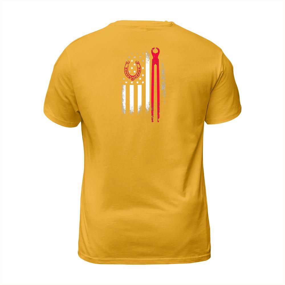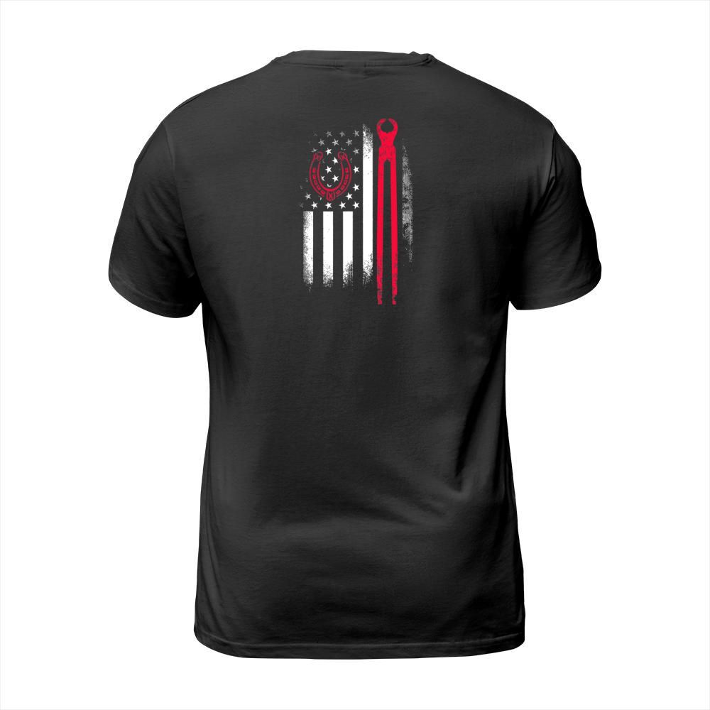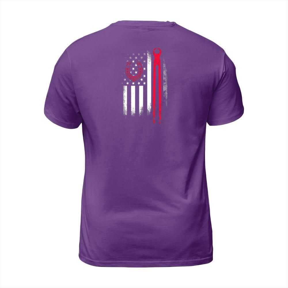 Shop Farrier Tools Flag Horseshoe Hoof Trimming Equine Shoeing T-Shirt Unisex custom made just for you. Available on many styles, sizes, and colors.