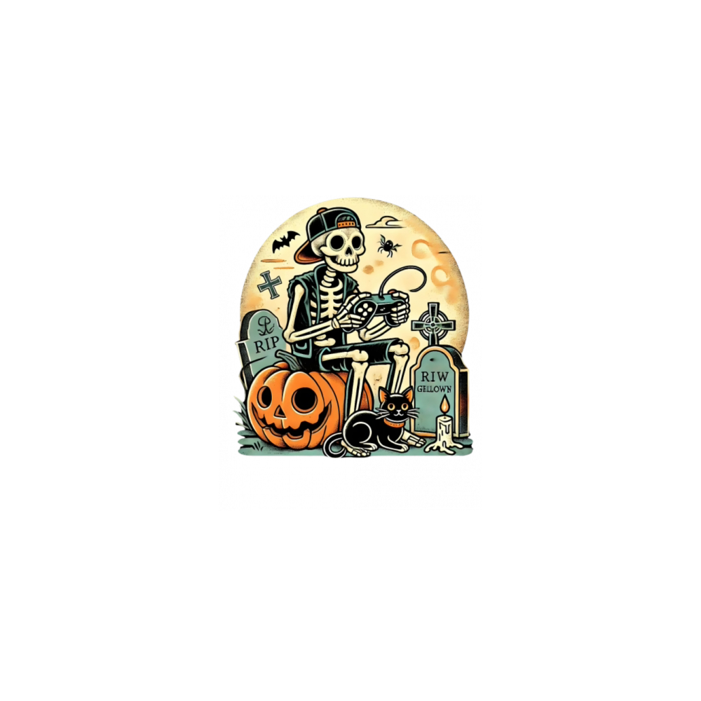 Halloween Skeleton Gamer in Graveyard Retro Cat