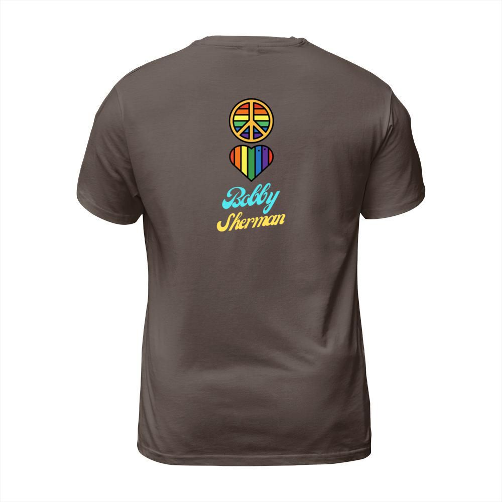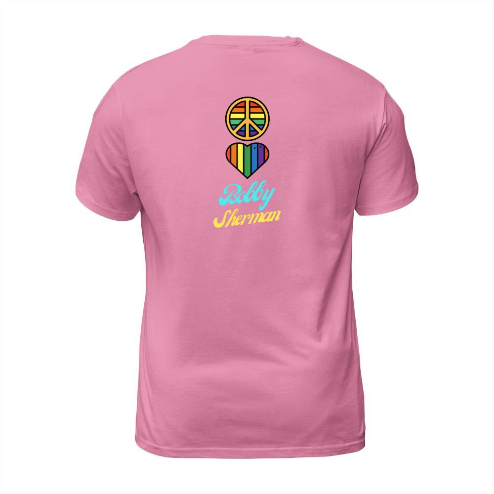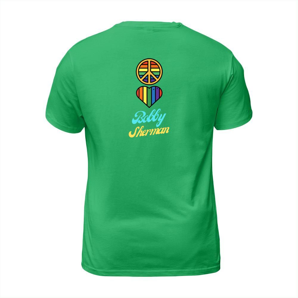 Shop Peace Love Bobby Sherman 60s 70s Groovy Greeting Rainbows T-Shirt Unisex custom made just for you. Available on many styles, sizes, and colors.