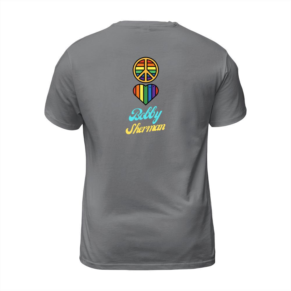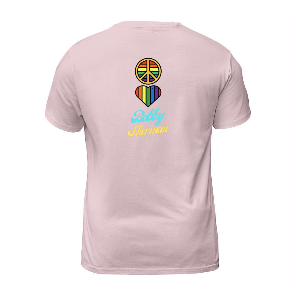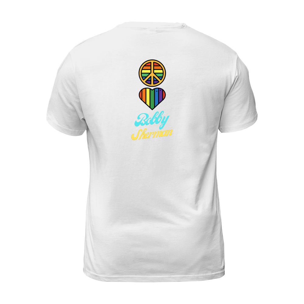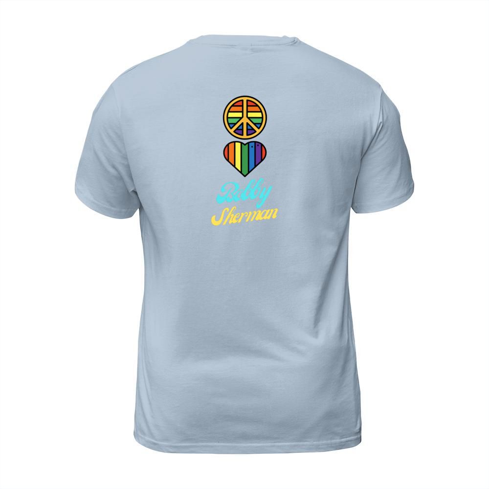 Shop Peace Love Bobby Sherman 60s 70s Groovy Greeting Rainbows T-Shirt Unisex custom made just for you. Available on many styles, sizes, and colors.