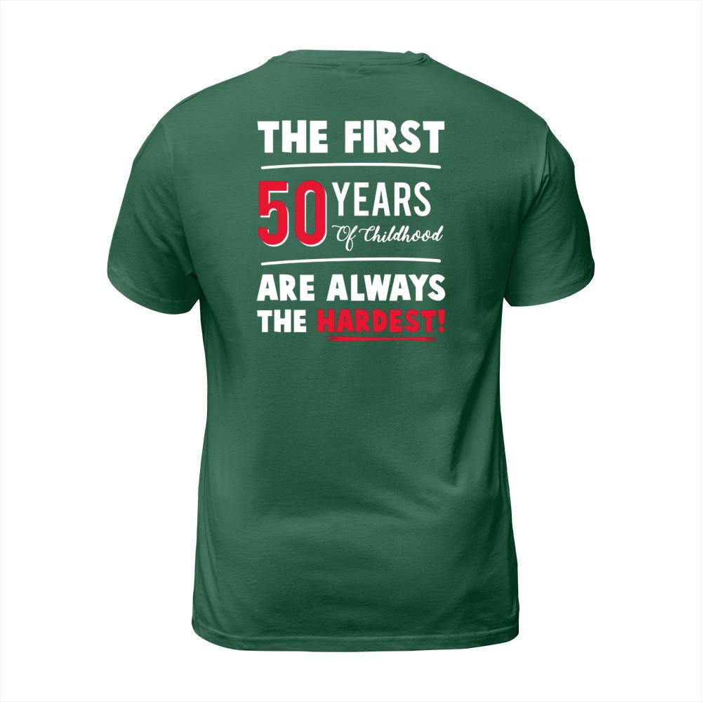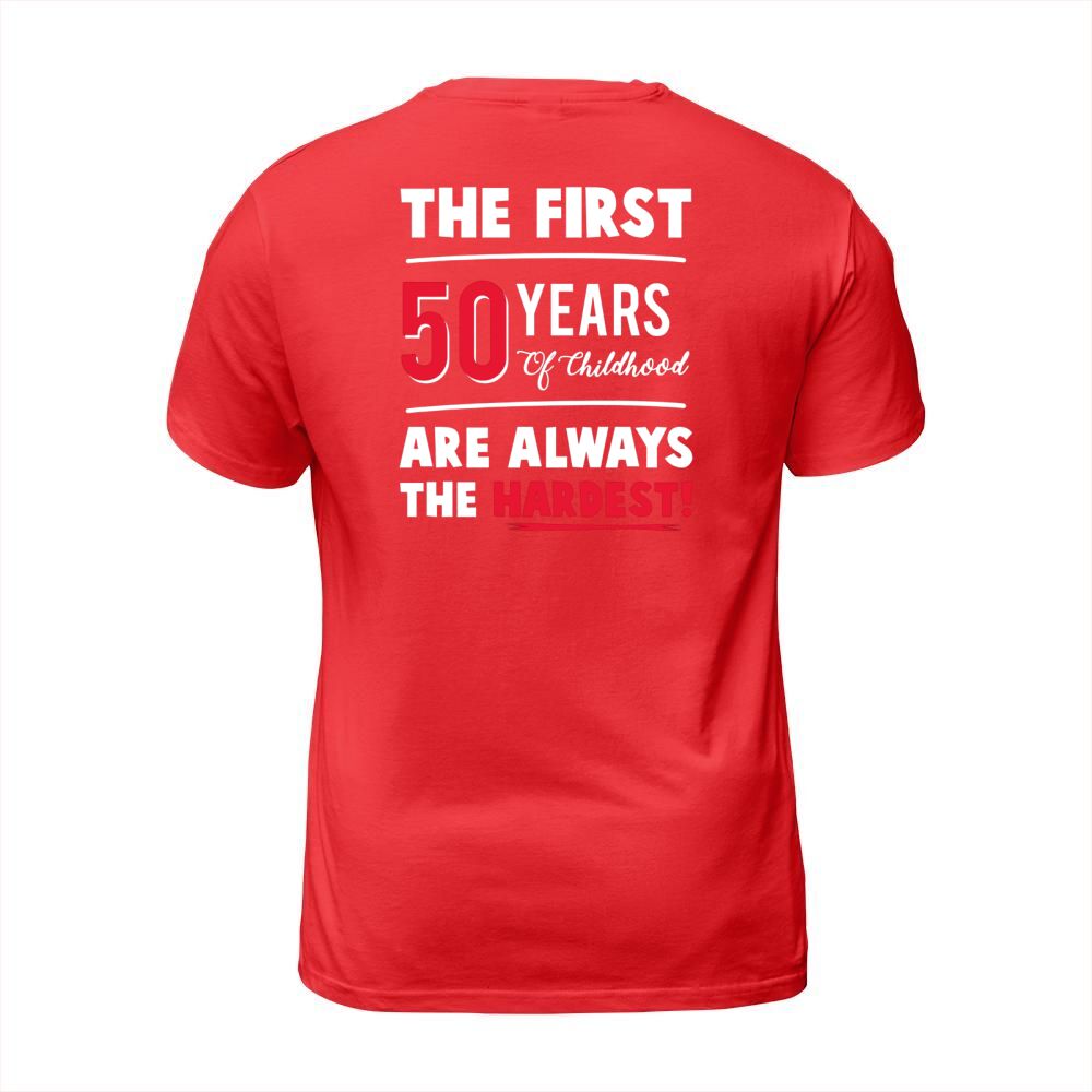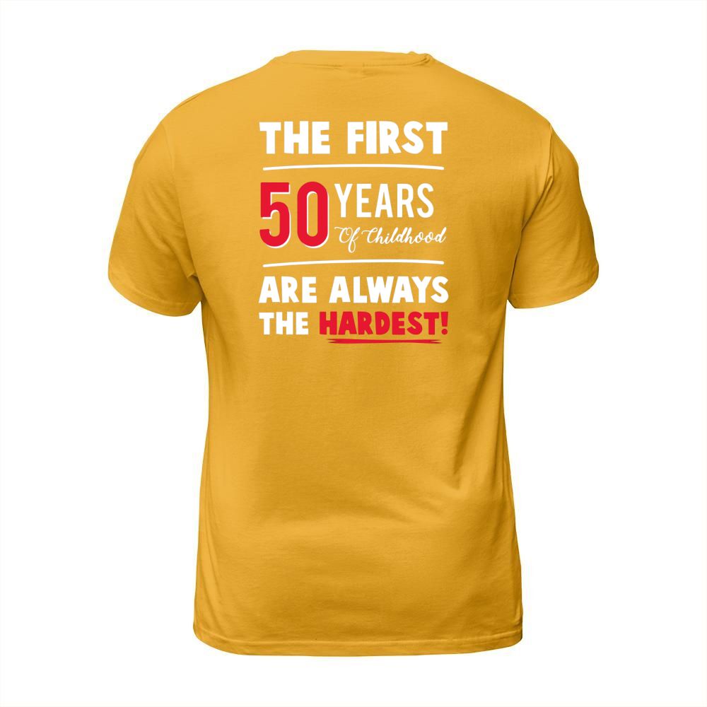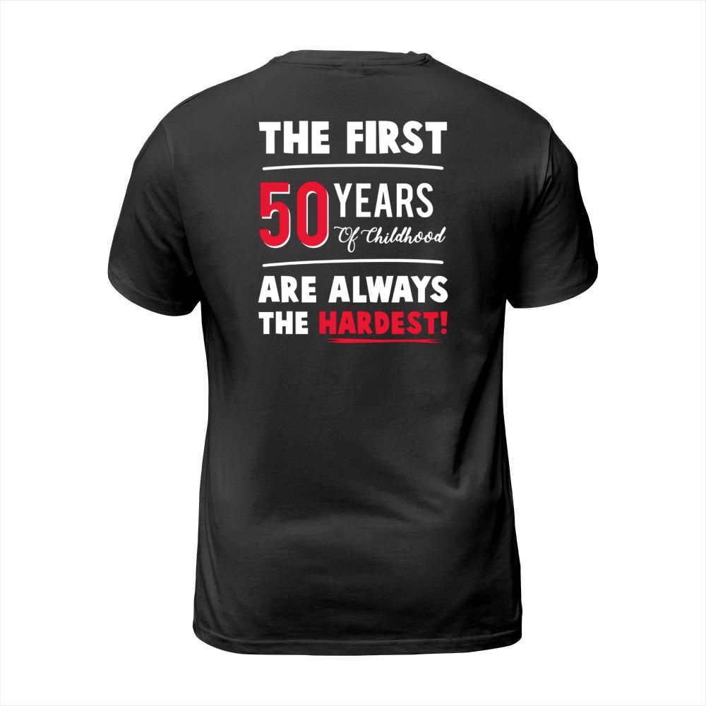 Shop The First 50 Years Of Childhood Are Always Hardest Funny Tee T-Shirt Unisex custom made just for you. Available on many styles, sizes, and colors.