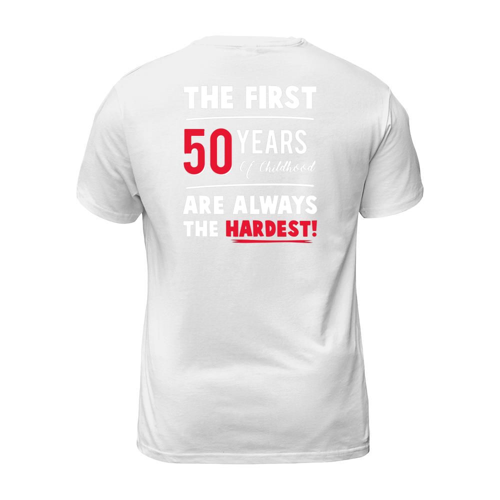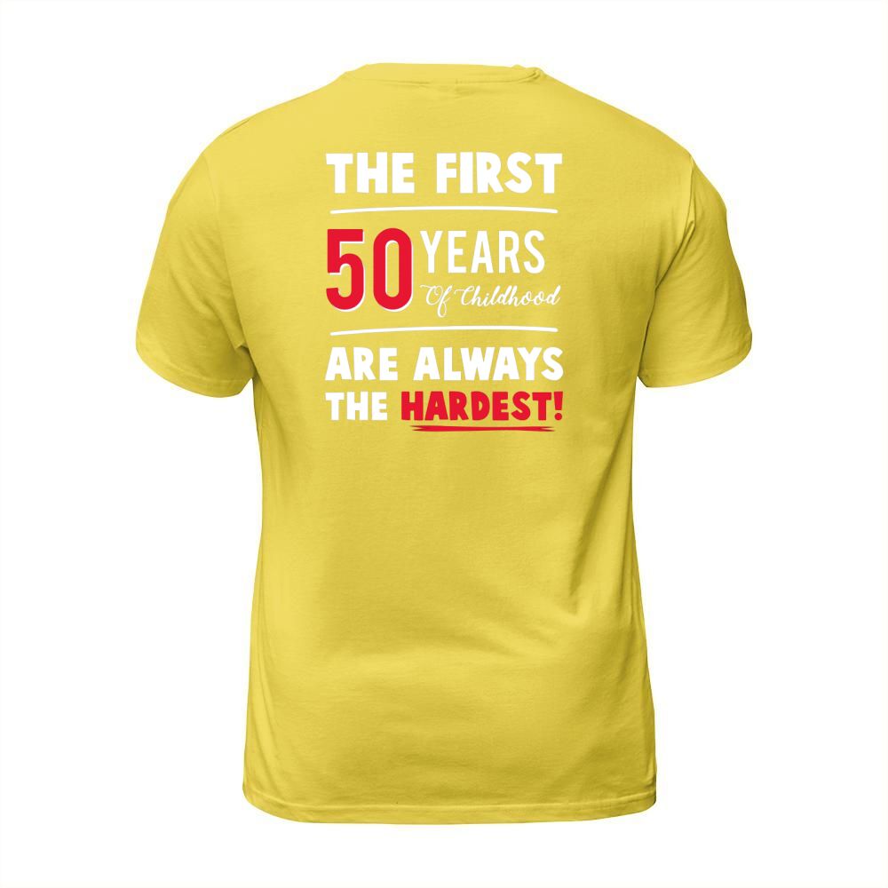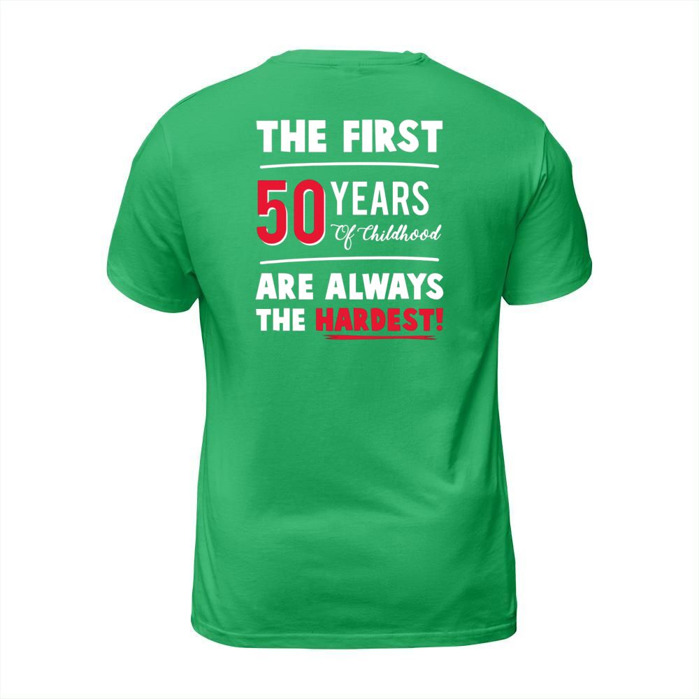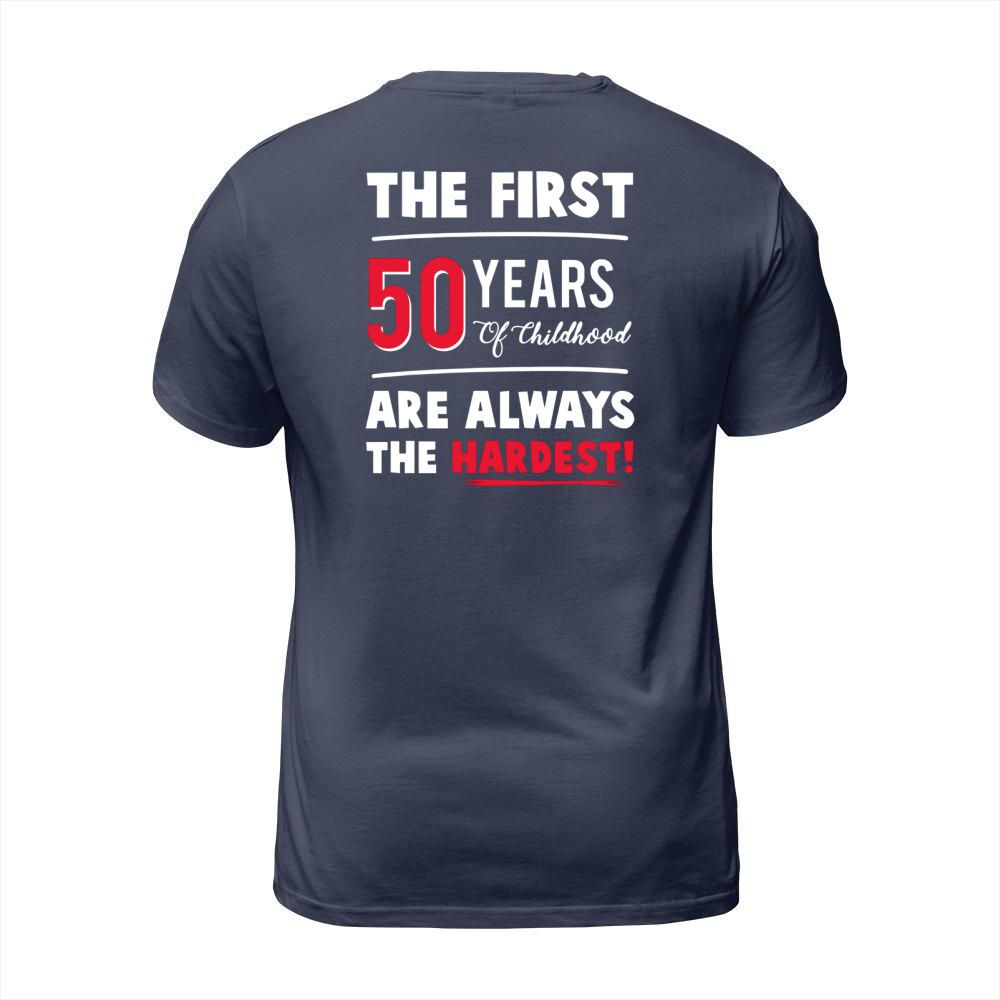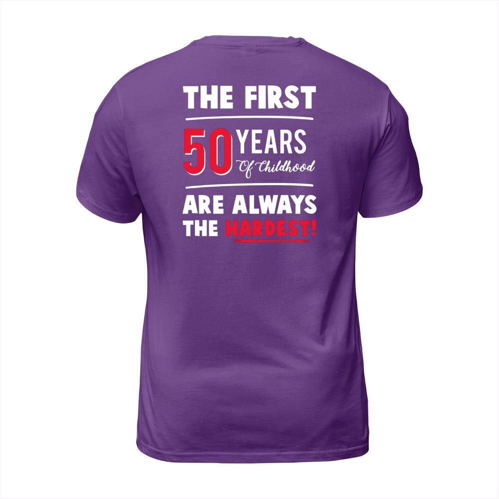 Shop The First 50 Years Of Childhood Are Always Hardest Funny Tee T-Shirt Unisex custom made just for you. Available on many styles, sizes, and colors.